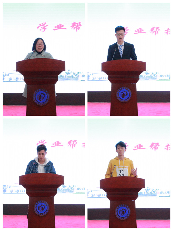 杨倩首先介绍了学业帮扶中心的情况,并代表学院对“授课小老师”开展的学业帮扶活动表示了感谢;“授课小老师”代表、2016级学生姜龙滨分享了他进行学业帮扶的心得体会。他认为在为学弟学妹开展学业辅导的过程中,他进一步加深了对知识的思考和理解,对自己的学习也是一种提升。同时,作为一名学生党员,通过服务同学,他进一步坚定了自己“密切联系群众”和“全心全意为人民服务”的理念,强化了党员的责任担当意识,锤炼了党性修养;2017级姜远丰、2018级张超作为受助学生代表进行了发言。他们表达了对学院和“授课小老师”的由衷感谢,认为在他们学习遇到困难、处于焦虑无助的时候,是学业帮扶中心开展的助学活动帮助他们提升了学习成绩,重新点燃了他们对学业进步的希望。
