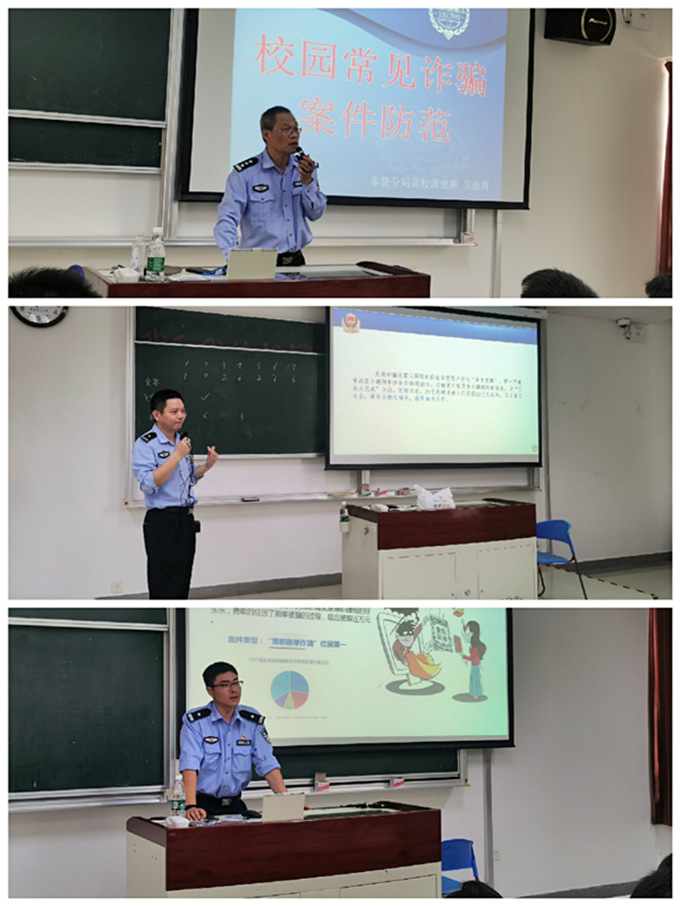 为加强学生安全意识,落实学院安全稳定工作,有效防范各类安全事件的发生,10月11日下午,yl23455永利集团邀请上海市公安局奉贤分局高校派出所警官吴振霄、王淑敏、张志荣来到奉贤校区,为2019级全体新生进行防诈骗安全教育讲座。本次讲座以小班化的形式开展,共计开设6场,由辅导员王玉琳、王秋辰主持。