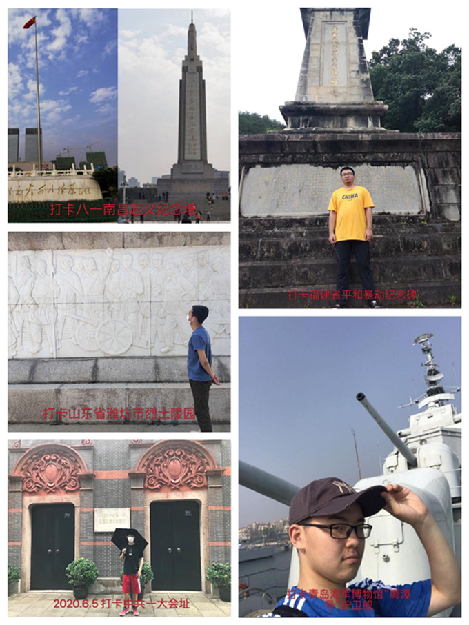 来自上海的机械类1901班明岳伟来到中共一大会址纪念馆,经典的石库门老建筑,青红交错的砖墙,一扇一扇挂着铜环的黑漆大门,让他体会到那个风雨如磐的年代,中国共产党人波澜壮阔的奋斗历程,在实践中进一步增强了对马克思主义的信仰;来自福建的材控181班陈一航参观了平和暴动烈士纪念碑,发现了很多与他同姓的革命烈士的石碑,深深感受到从革命先烈身上继承的热血正在自己的身上流淌;来自山东的过程171班曲逸凡来到潍坊革命烈士陵园,瞻仰了烈士纪念碑,学习了家乡先烈的革命事迹,深切感受到他们为了革命事业甘于牺牲的大无畏精神;来自浙江的过程171班乐祺中利用假期参观了青岛海军博物馆,他来到军舰上认真学习了党领导下的军队发展历史,认为青年学生应始终铭记中国曾经任人欺凌的历史,发奋读书,报效祖国。