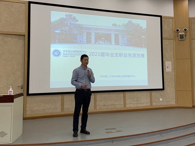 孙煜文通过详细的数据向同学们介绍了学院近两年就业、升学、出国等方面的情况,建议同学们从自身实际出发,抓紧时间迈开求职第一步。