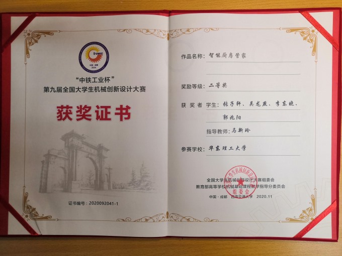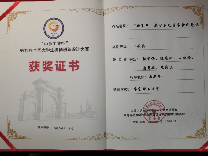 2020年11月20日至22日,第九届全国大学生机械创新设计大赛决赛在四川成都西南交通大学举行。本届大赛主题为“智慧家居,幸福家庭”,来自全国30个省(直辖市、自治区)678所高校的十余万大学生参赛。我校机动学院马新玲老师指导的作品《“趣享吃”花生葵瓜子零食剥壳机》获得全国一等奖;作品《智能厨房管家》获得全国二等奖。这是华理学子从2004年首届国赛参赛以来第三次闯入决赛、第二次获得全国一等奖。