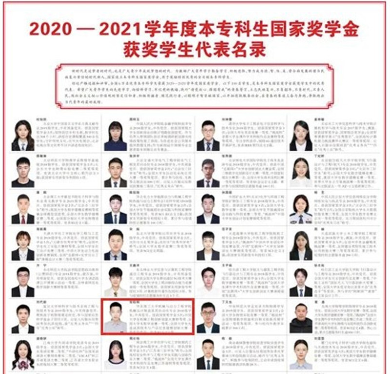 5月4日,《人民日报》刊登《2020-2021学年度本专科生国家奖学金获奖学生代表名录》,我校yl23455永利集团机械设计制造及其自动化专业2018级本科生张钰炯从6万名本专科国家奖学金获奖学生中脱颖而出,作为全国100名优秀学生代表荣登该名录。