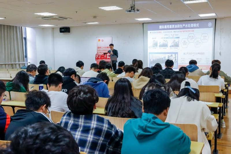 刘懿谦首先带领同学们学习了党的二十大报告中的关于“保护海洋生态环境,加快建设海洋强国”的重要战略部署,结合自己的永利集团及社会实践经历,讲述了在杨强教授的指导下,带领实践团队秉承“十年磨一剑”的精神,勇于攻克海洋油气绿色开采过程中的“卡脖子”技术,持续推动实验室成果转化落地,服务解决海洋油气田生产水处理难题的故事。他结合党的二十大精神、习近平总书记在庆祝建团100周年上的重要讲话精神,以新工科改革建设为契机,围绕加快建设海洋强国的重大战略需求,以所在科研和实践团队在南海Y13-1和渤海CFD-11-2等平台项目中负责油、气、水的高效分离为例,详细介绍了海洋油气资源开采的方式,并分享了基于调研实践中发现的生产废水处理难题,在杨强教授的指导下,和团队一起进行了单纤维流动捕获、亲疏水组合纤维破乳除油、成套技术装备的构建等系统研究,开展“深耕蓝色海疆 助力美丽中国”科研服务实践,与“深海一号”开展庆祝华理建校70周年党建共建活动等,致力于解决困扰我国海洋开采废水处理中的重要难题,培养新时代蔚蓝力量。