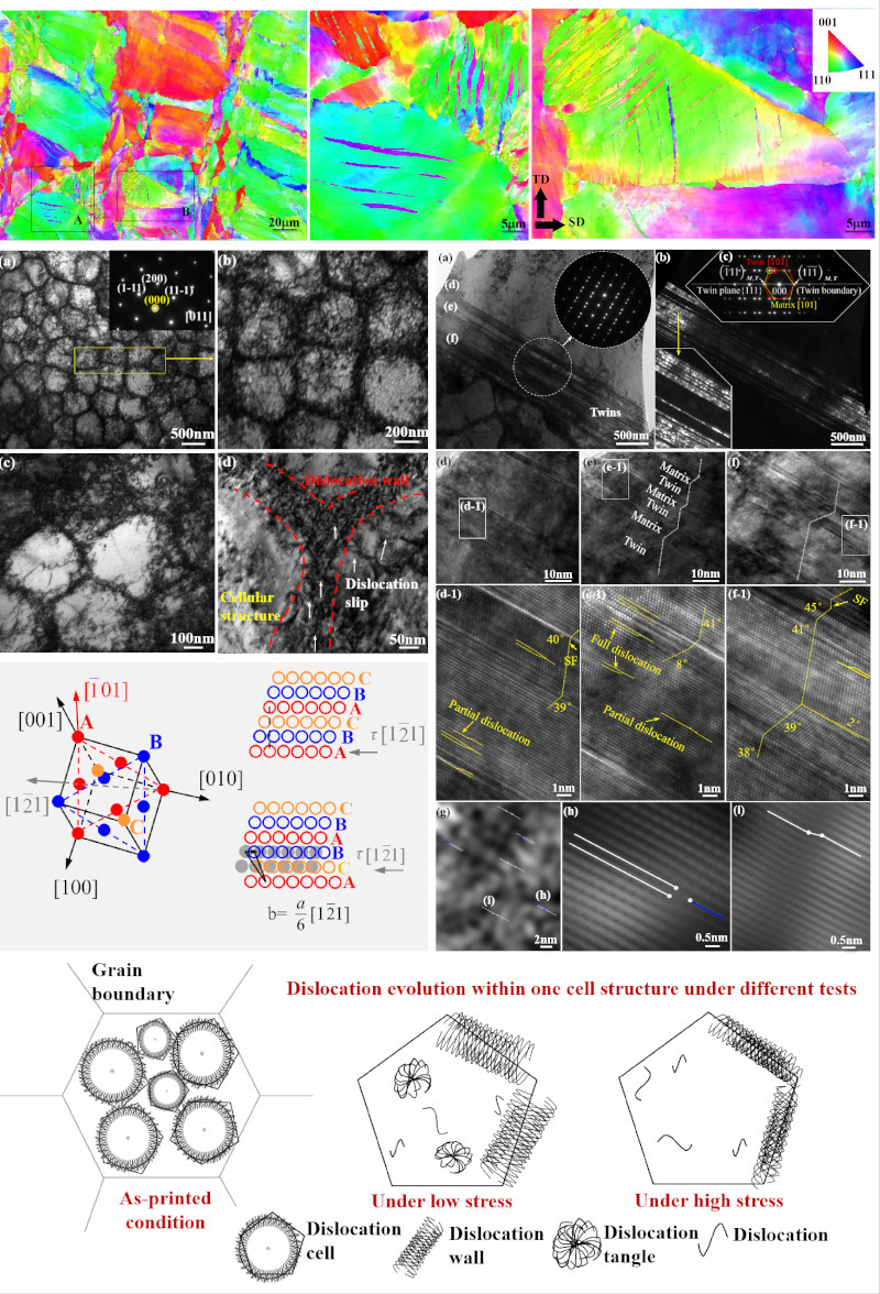 近日,yl23455永利集团的硕士研究生陈亦楠围绕L-PBF增材制造面心立方晶体(FCC)结构的CoCrFeNi高熵合金在交变载荷工况下的疲劳行为及损伤演变机制持续深入研究;发现激光快速非平衡熔凝的CoCrFeNi微观结构含有高密度的小角度晶界、异常显著的晶内胞状亚结构和原子堆垛层错特征,促使在较低应力水平的交变应力下诱发大量纳米孪晶,建立和阐明了上述因素交互作用的物理机制模型;探明了在L-PBF增材制造CoCrFeNi疲劳行为中的位错胞(Dislocation cells)演变过程及其与晶内胞状亚结构(Cellular structures)的交互作用机理,位错受胞壁结构(Cellular walls)阻碍、在一定范围往复移动导致位错湮灭、解离和重排,位错重排则倾向于形成较低能量构型,即具有交替高-低密度位错区域的新型位错胞壁(Dislocation cell-walls),这不仅改善了高周疲劳性能,同时能阻碍位错的大范围移动,为反应生成纳米孪晶提供了更大可能;此外,通过施密特因子计算及相同尺寸、不同取向的晶粒内部诱发孪晶比例量化对照,意外发现L-PBF增材制造FCC系列HEAs纳米孪晶更易在<110>取向的晶粒内部产生,这可为通过L-PBF激光工艺改变微观晶粒取向分布、实现构-性精准调控和强韧取向性的人工设计,提供新的可行路径。