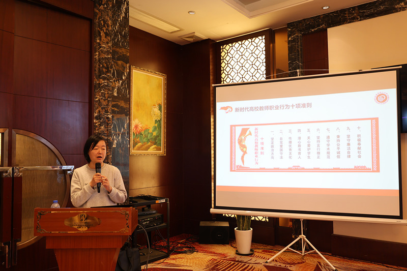 党委副书记李煜佳就纪委工作和师风师德建设工作做了介绍,带领大家共同学习了《新时代高校教师职业行为十项准则》,希望大家做政治觉悟高、职业道德好、专业能力强的新时代高校教师。