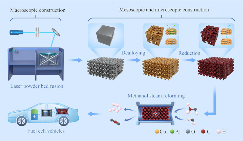图1 3D打印-脱合金技术制备的铜基多级多孔“整体催化剂”在MSR中的应用示意图