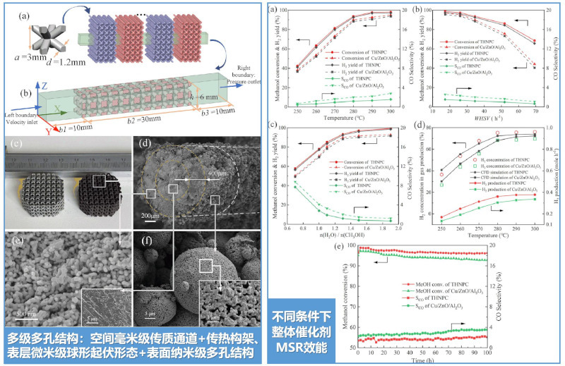 针对上述技术挑战,yl23455永利集团的于新海教授新能源装备研究团队与李博副教授增材制造(3D打印)研究团队开展合作,实现颠覆传统的“整体催化剂”解决方案:融合“预合金3D打印”与“脱合金”技术,研制具有“空间毫米级传质通道-传热点阵构架”和“表层微米级球形起伏形态-表面纳米级多孔结构”一体化的多级多孔铜基催化器;在质量空速为34.6h-1、反应温度280℃、水醇比1.3的条件下,这类多级多孔铜基“整体催化剂”性能优于目前报道的其他同质体系催化剂,甲醇转化率达93.6%、干重整气中的CO浓度低于0.3%。同时,铜基多级多孔3D架构的整体式催化剂具有高效的传质、传热性能,并显著降低流体介质压降,在氢燃料电池汽车领域具有重要的应用前景。