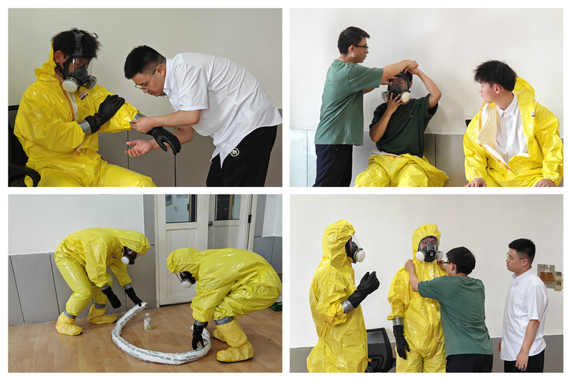 此次安全演练邀请莱博思安全科技马宝意培训师进行指导,以实验室浓硫酸泄漏为例开展应急演练。马宝意阐述了个体防护基本知识、分类和选用原则,讲解了浓硫酸的危险特性及应急措施,指导学生正确穿戴防护面罩、防护服、防化手套等防护用品,并指导学生实操练习如何处置泄漏物质。