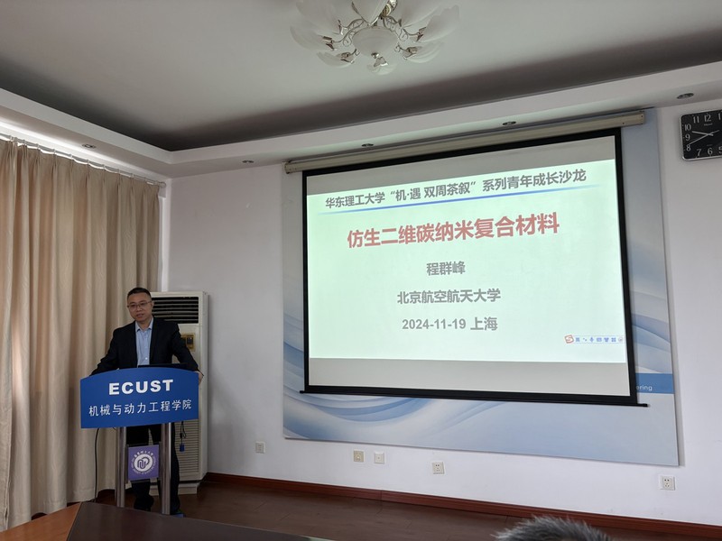 11月19日上午,“机·遇 双周茶叙”系列青年成长沙龙(第二十期)在徐汇校区举行。本次活动邀请了北京航空航天大学化学学院程群峰教授作题为“仿生二维碳纳米复合材料”的学术报告。机动学院副院长白志山、张博威特聘研究员、王涛特聘副研究员、化学与分子工程学院张斌副教授等多位老师以及硕博士研究生参与了本次活动。
