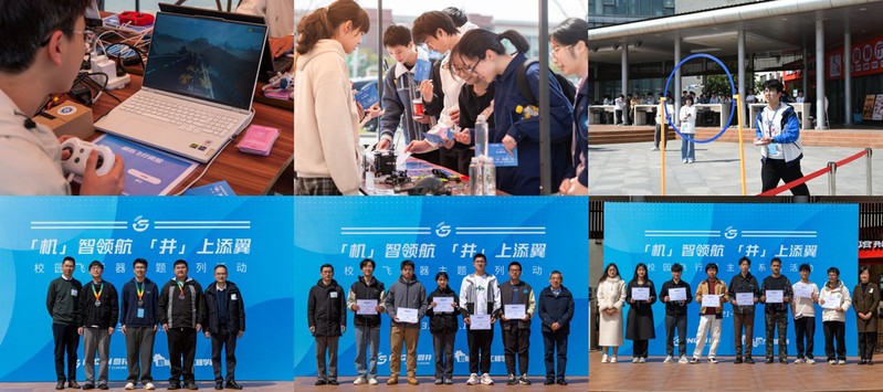 本次活动分为飞行嘉年华和微型无人机竞速挑战赛。在飞行嘉年华区域,机动学子化身专业讲解员,向到场来宾及同学们介绍多级模型火箭、微型飞行器和CADC赛事。活动期间,同学们在模拟飞行区,沉浸式体验学习了3D无人机操控与微型无人机试飞项目。在微型无人机竞速赛场上,来自9个学院的110名选手们争分夺秒地操控无人机灵活穿梭,在紧张而激烈的对决中,选拔出了16支获奖团队。白志山、李煜佳、易建军、陈建钧、范四辈与吴振宇分别为获奖选手颁奖。